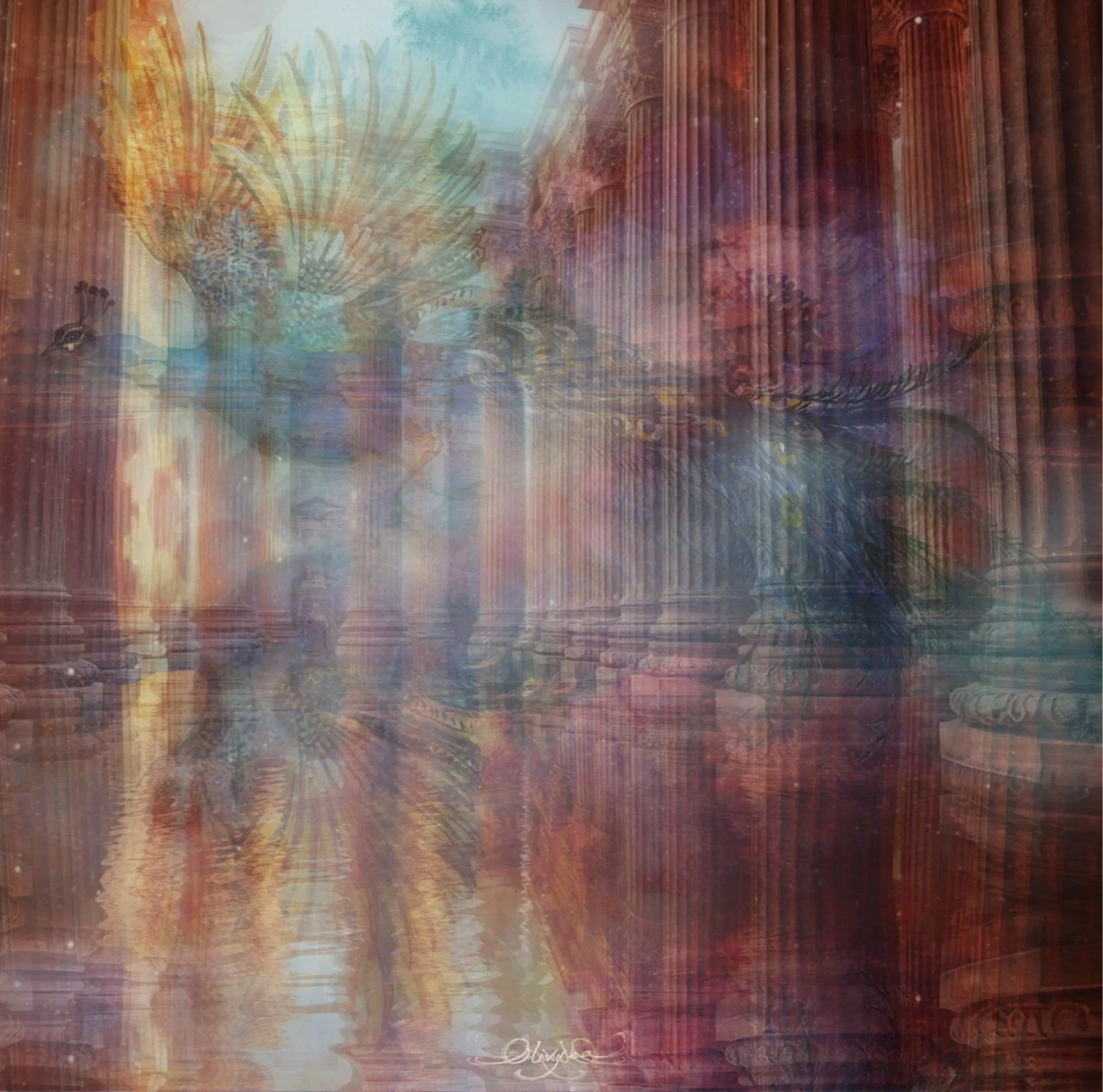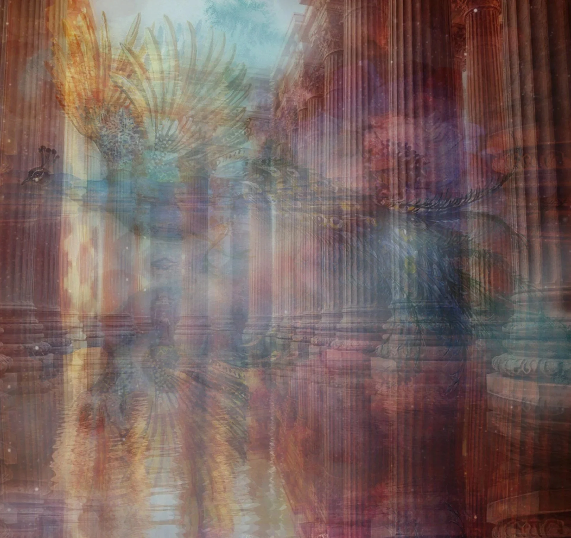 (I did not actually intend for those giants to appear at all. I just laid down the images and watched what would take place. All of my work is this way—like the feathers of the wings, somehow forming the two faces in “Healing The Home Of The Original People”.)